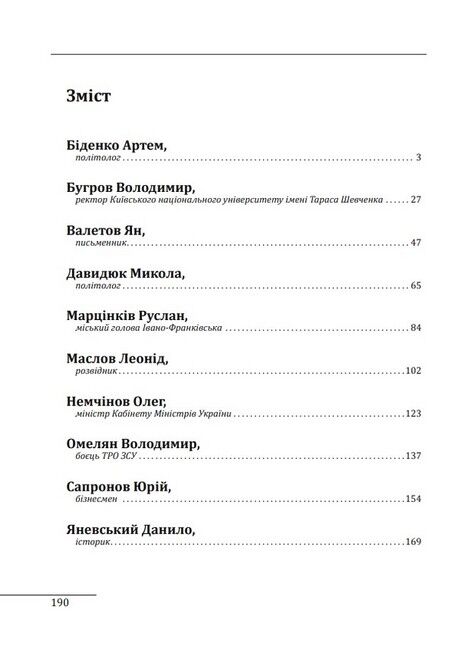 У новій книжці Олександра Красовицького вміщено інтерв’ю з десятьма дуже різними за віком, фахом та життєвим досвідом людьми, яких об’єднує прагнення покінчити з агресією російської федерації і відновити Україну, зробивши її більш могутньою, економічно розвиненою і по-справжньому демократичною. Ці люди багато зробили для нашої країни — під час Помаранчевої Революції, на барикадах другого Майдану, в АТО та зараз на полях битв російсько-української війни — і тому сподіваються, що їхнє бачення майбутньої України буде втілене в життя.