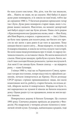 Цю книжку склали чотирнадцять історій кримськотатарських родин, які розповіли авторці різні люди, відомі й невідомі. У них спільний біль і спільна пам?ять про жахіття війни, гоніння, депортації, голод. З покоління в покоління їх переслідує один і той самий ворог, яку б нову назву він щораз для себе не придумував: чи то російська імперія, чи то срср, чи то російська федерація. Тортури, до яких він вдається, мають приборкати кримських татар, а в разі непокори нелюди просто знищують і так нечисленний народ. Ніби наяву читач побачить змучених підлітків, які збирають бавовну в Голодному степу Узбекистану. Розпач жінки, яку виганяють з рідної домівки. Горе дружини загиблого захисника України. Та об?єднані ці родини не тільки спільним болем, а й спільним прагненням: повернути собі Батьківщину, жити у вільному Криму.