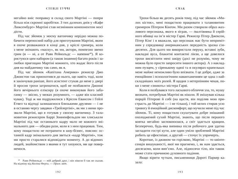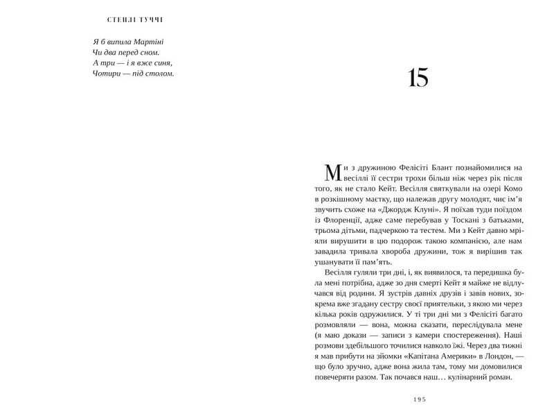 Перш ніж стати «тим самим актором» із «Диявол носить “Прада”», «Милих кісток» чи «Голодних ігор», а також творцем ідеального негроні, Стенлі Туччі ріс в італо-американській родині, яка кожен вечір проводила за столом. Ця книжка — його роздуми про взаємозв’язок життя та їжі, гастрономічна подорож у минуле, як щасливе, так і болісне, написана з любов’ю й щедро приправлена фірмовим гумором.