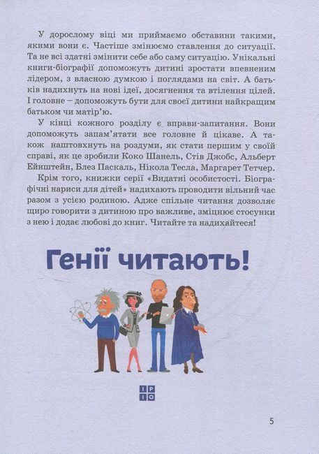 Це багатогранна книга-біографія з якої можна дізнатися цікаві факти з різних областей. Книжка захопить і дорослого, і дитину. Її цікаво читати разом чи самостійно, це чудовий спосіб проводити дозвілля. У кінці кожного розділу є питання-завдання, котрі не лише допоможуть запам’ятати корисну інформацію, а й підштовхнуть на роздуми, що насамперед потрібно робити, щоб бути першим, як Стів Джобс.