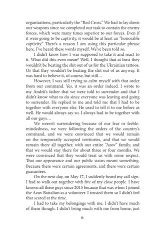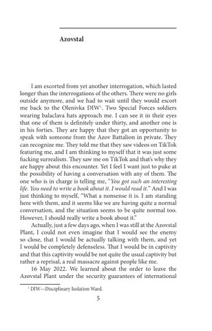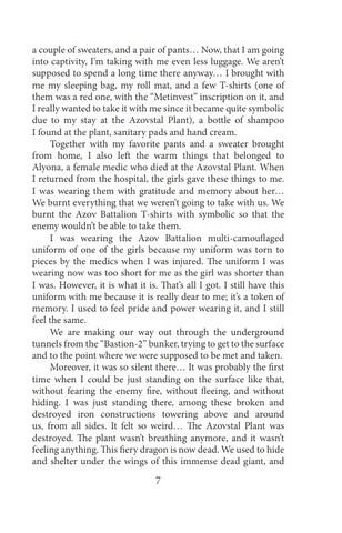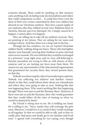 For 86 days, the Ukrainian military held defenses in the surrounded Mariupol and on the territory of the Azovstal plant. In order to preserve the lives of the soldiers and save the wounded, the defenders—by order of the higher military command—stopped standing on the defensive, left the territory of the plant and were to surrender to the so-called "honorable captivity" in the presence of international organizations and observers, with the condition of exchange within 3-4 months. Valeriya "Nava" Subotina was part of the press service of the "Azov" regiment. She was enforced to stay in captivity—first in Olenivka, then in Taganrog prison—for over 11 months. In this book, Valeriya described all the circles of hell that she went through for almost a year. Constant surveillance, control, humiliation, inhumane conditions of detention, critical shortage of food and water, attempts of the enemy to break her physically and morally, subjugate her, intimidate her, and push her to treason—Valeriya had to experience all these. Interrogations and torture were exhausting. The impossibility of getting in touch with friends and relatives, misinformation and enemy propaganda would take away the last hope for exchange and freedom. Nevertheless, captivity did not break the intrepid woman; now she is a witness to the crimes of the Russian Federation.