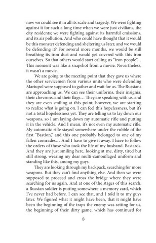 Протягом 86 днів українські військові тримали оборону в оточеному Маріуполі та на території заводу "Азовсталь". Щоб зберегти життя солдатів і врятувати поранених, захисники—за наказом вищого військового командування—перестав стояти на обороні, покинули територію заводу і мали здатися так званому "почесному полону" в присутності міжнародних організацій та спостерігачів, з умовою обміну протягом 3-4 місяців. Валерія "Нава" Суботіна була частиною прес-служби полку "Азов". Її примушували перебувати в полоні - спочатку в Оленівці, потім у в'язниці Таганрог - понад 11 місяців. У цій книзі Валерія описала всі кола пекла, через які вона пережила майже рік. Постійний нагляд, контроль, приниження, нелюдські умови утримання, критичний дефіцит їжі та води, спроби ворога зламати її фізично та морально, підкорити її, залякати її та підштовхнути до зради - Валерія повинна була пережити все це. Допитання та катування були виснажливими. Неможливість зв’язатися з друзями та родичами, дезінформація та ворожа пропаганда позбавить останньої надії на обмін та свободу. Тим не менш, полон не зламав нестримну жінку; тепер вона є свідком злочинів Російської Федерації.