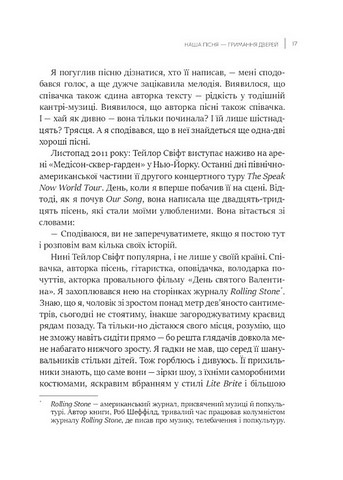 \nНіхто не розповість цю історію краще, ніж Роб Шеффілд — автор бестселерів і лауреат премій, відомий за книжками Dreaming the Beatles, On Bowie та Love Is a Mix Tape. Легендарний журналіст Rolling Stone, який висвітлював кар'єру Тейлор на кожному її етапі — від перших кроків до туру Eras. Шеффілд проникає в саму суть Свіфт, її музики, текстів, зв’язку з фанатами та потужної емоційної сили.