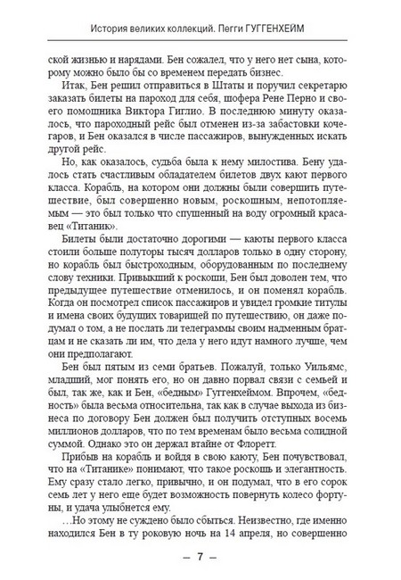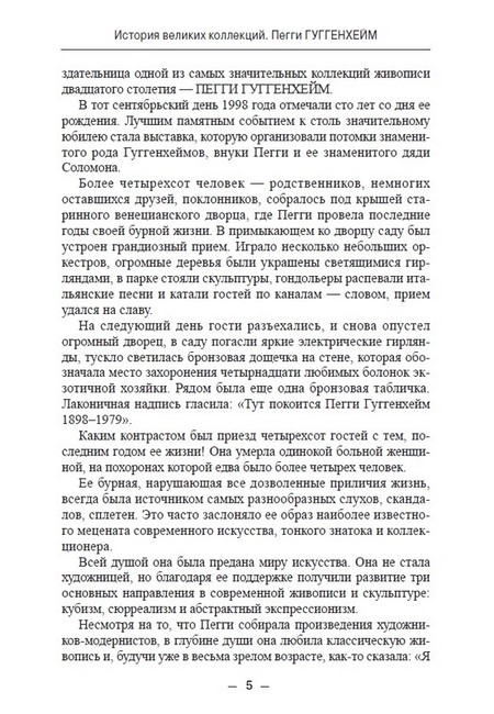 Серия «ЖЗЛ» — это сложные и увлекательные биографии крупных деятелей искусства — эмигрантов и выходцев из эмигрантских семей. Это рассказ о людях, которые, несмотря на трудности эмигрантской жизни, достигли вершин в своей творческой деятельности и вписали свои имена в историю мирового искусства. Пегги (Маргарит) Гуггенхейм (1898–1979) была не просто крупнейшим меценатом и одним из самых выдающихся коллекционеров прошлого века. «Она буквально поставила на ноги современное искусство», — писала The New York Times. Именно Пегги стояла у истоков того, что несколько лет спустя вылилось в целое направление — абстрактный экспрессионизм. Ее знаменитая художественная коллекция находится в одном из принадлежавших ей палаццо в Венеции, где Пегги жила последние годы.