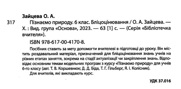 Бліцоцінювання Пізнаємо природу 6 клас НУШ Авт: О.А. Зайцева Вид-во: Основа 90447