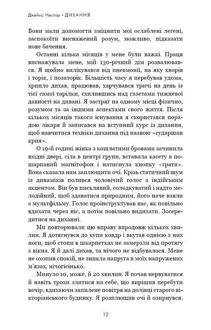 «Дихай!» — цей заклик-прохання-пораду ми часто чуємо в різних, зазвичай складних, ситуаціях. Але навряд чи ми розуміємо, наскільки важливо дихати правильно й усвідомлено. На жаль, давнє мистецтво дихання, яким люди користувалися для зцілення — як фізичного, так і душевного, — нині майже втрачене. Журналіст Джеймс Нестор узявся за його відновлення. Для цього він мандрує світом, зазираючи в забуті й таємничі його куточки й шукаючи змоги відновити секрети цілющого дихання та поділитися ними з людьми. І йому це вдалося! Сучасні дослідження свідчать, що техніка правильного дихання здатна допомогти при багатьох хворобах, поліпшити спортивні результати, омолодити організм і навіть вирівняти пошкоджений хребет. Поєднання давніх практик із новітніми науковими підходами дає змогу взяти на озброєння потужний інструмент, що може змінити життя.