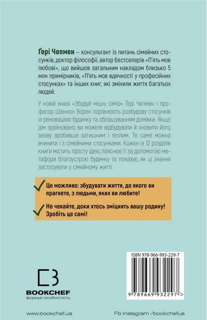 У книзі «Збудуй міцну сім’ю» Ґері Чепмен, автор бестселера «П’ять мов любові», й професор Шеннон Ворен порівнюють розбудову стосунків зі спорудженням будинку та облаштуванням домівки. Якщо дім зруйновано, ви можете відбудувати й оновити його, знову зробивши затишним і теплим. Те саме можна вчинити і з сімейними стосунками. Кожен із 12 розділів книги містить просту ідею, пояснює її за допомогою метафори благоустрою будинку й показує, як ці знання застосовувати в сімейному житті. Прочитавши книгу, ви отримаєте 12 інструментів для поліпшення стосунків і поради, як сформувати корисні звички для щасливого сімейного життя.
