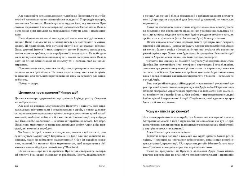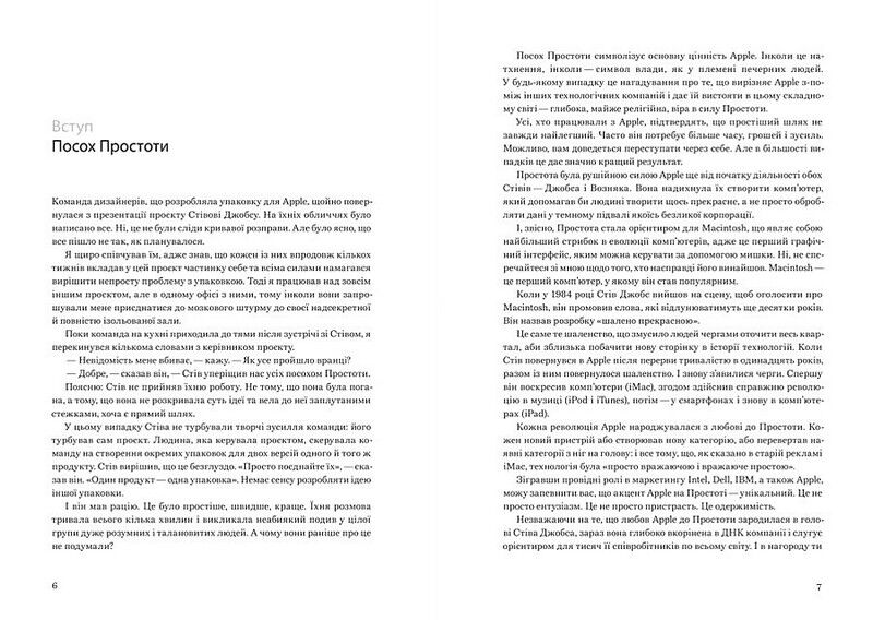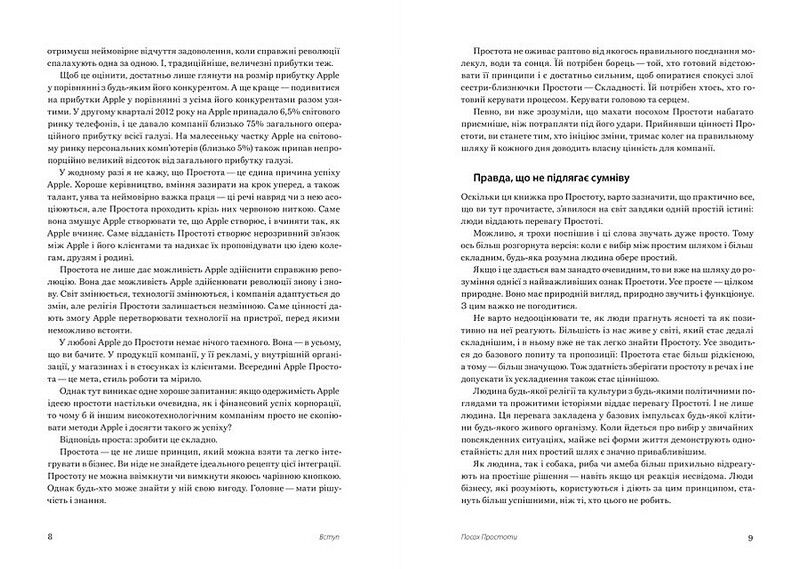 Для Стіва Джобса простота була не просто принципом дизайну. Це була релігія і зброя. Одержимість Простотою – це те, що відрізняє Apple від інших технологічних компаній. Це те, що допомогло Apple оговтатися від ризику зникнення в 1997 році, щоб стати найдорожчою компанією світу в 2011 році. Цей принцип зумовлює, як Apple організована, як вона розробляє продукти та як вона спілкується з клієнтами. Саме завдяки руйнуванню сил складності компанія залишається на своїй зірковій траєкторії.