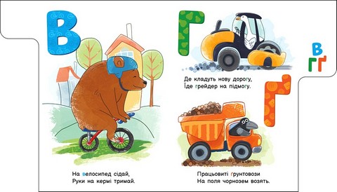 Кожна сторінка цієї книги ілюструє певну машину, яка починається з певної літери алфавіту. Такий підхід сприяє не лише вивченню абетки, а й розвитку уяви та слухового сприйняття.