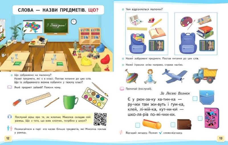 Посібник звернеться до дитини, заговорить і заспіває разом з нею. У QR-кодах із посиланнями на аудіофайли вміщено тексти для слухання, озвучені професійними дикторами, мовлення яких стане взірцем для учнів/учениць. Після завершення слухання відбувається робота над виконанням завдань, які спрямовані на перевірку розуміння усної інформації.