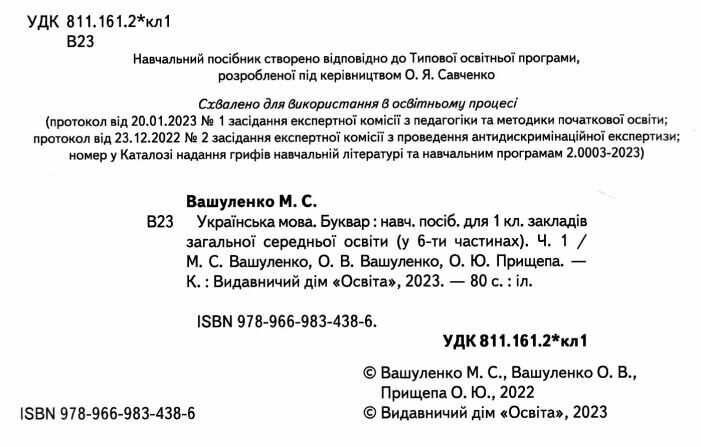 Навчальний посібник Українська мова Буквар 1 клас у 6-ти частинах Частина 1 НУШ Авт: Вашуленко М.С. та ін. Вид-во: Освіта 90883