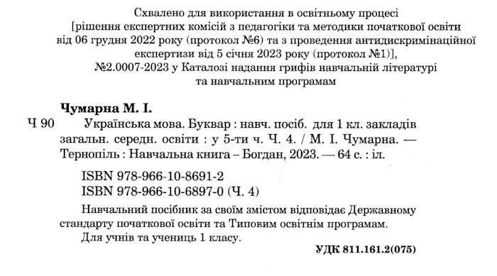 Навчальний посібник Українська мова Буквар 1 клас у 5-ти частинах Частина 4 НУШ Авт: Чумарна М.І. Вид-во: Богдан 90891