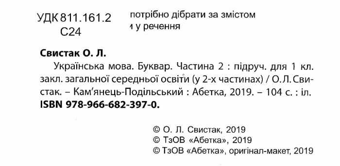 Підручник Українська мова Буквар 1 клас Частина 2 НУШ Авт: Свистак О.Л. Вид-во: Абетка 30378
