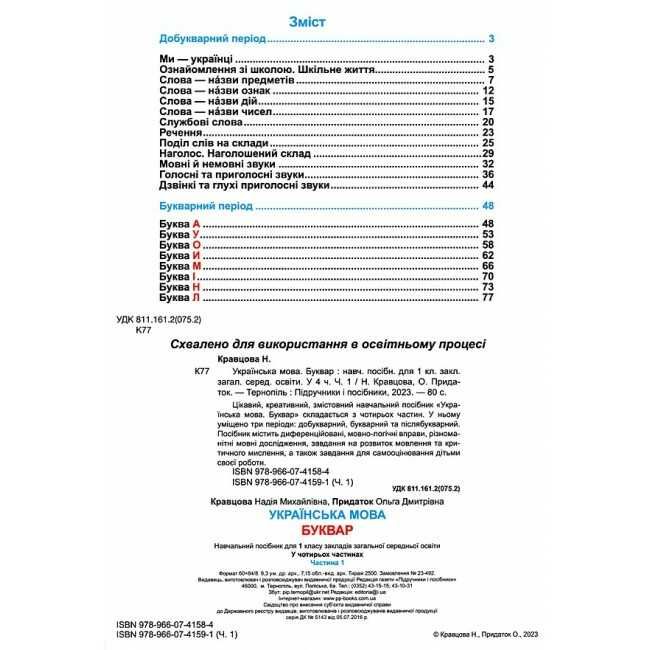 Цікавий, креативний, змістовний навчальний посібник «Українська мова. Буквар» складається з чотирьох частин. У ньому уміщено три періоди: добукварний, букварний та післябукварний. Посібник містить диференційовані, мовно-логічні вправи, різноманітні мовні дослідження, завдання на розвиток мовлення та критичного мислення, а також завдання для самооцінювання дітьми своєї роботи.