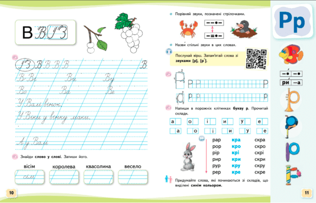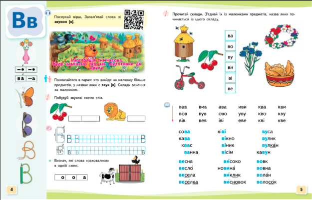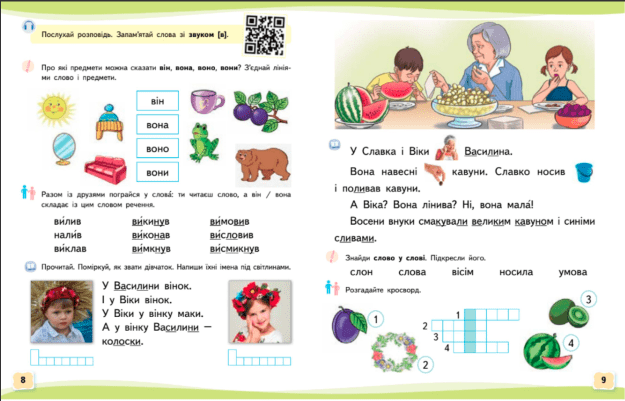 Посібник звернеться до дитини, заговорить і заспіває разом з нею. У QR-кодах із посиланнями на аудіофайли вміщено тексти для слухання, озвучені професійними дикторами, мовлення яких стане взірцем для учнів/учениць. Після завершення слухання відбувається робота над виконанням завдань, які спрямовані на перевірку розуміння усної інформації.