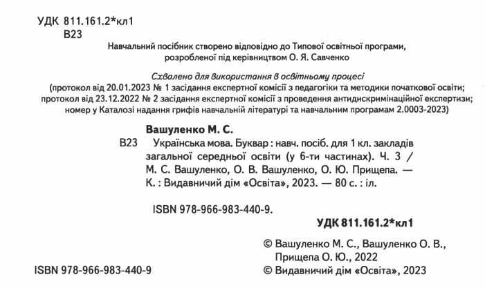 Навчальний посібник Українська мова Буквар 1 клас у 6-ти частинах Частина 3 НУШ Авт: Вашуленко М.С. та ін. Вид-во: Освіта 94082