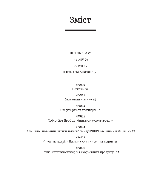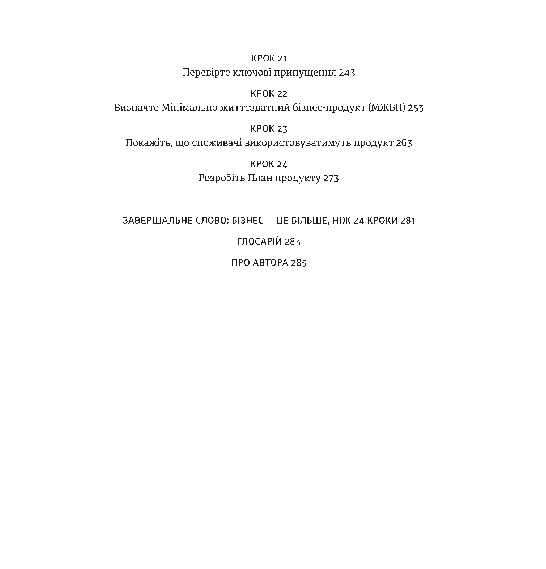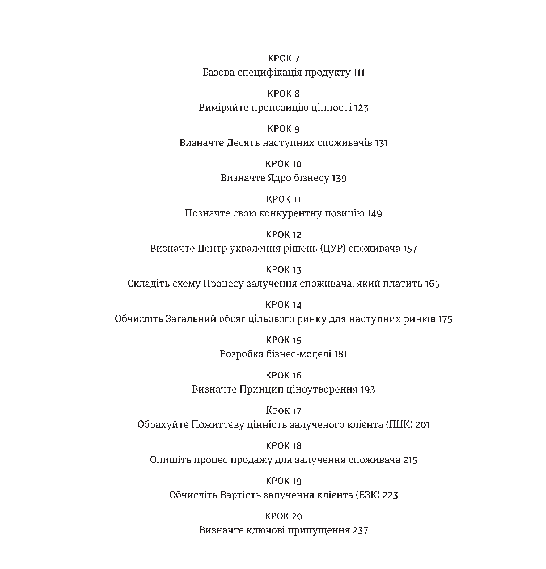 Стосовно 24 кроків, то до них входять: сегментація ринку, визначення ядра бізнесу, розробка бізнес-моделі, визначення принципу ціноутворення тощо. Також автор пояснює, як розрізнити інноваційне та середнє підприємництво, розвинути власні ідеї, проаналізувати спектр потенційних споживачів.
