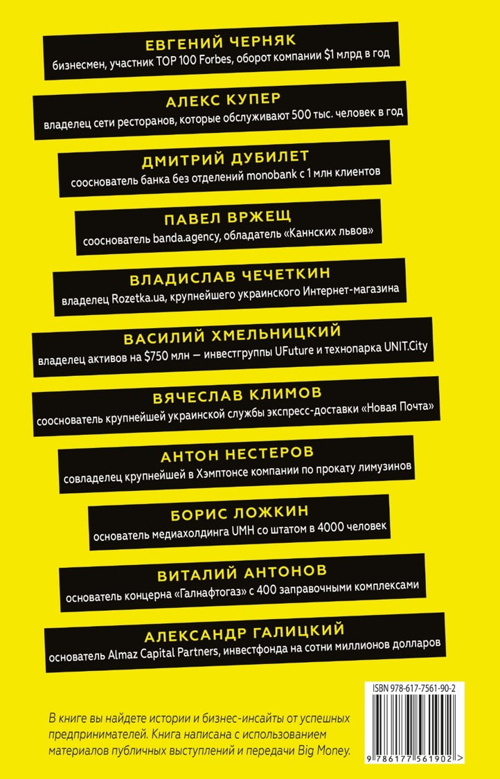 Вопреки стереотипам, это не скучные, угрюмые капиталисты, у которых в голове только деньги. Это интересные, умные, харизматичные люди, которые, как и каждый из нас, каждый день нуждаются в успехе и сожалеют о том, что времени для этого всегда не достаточно. Их отличие только в том, что все они одержимые своей идеей перфекционисты. А именно таким будет принадлежать Мир будущего. Я очень волнуюсь. В твоих руках, уважаемый читатель, моя первая книга, состоящая из интервью успешных предпринимателей в YouTube — проекте Big Money. Книга о людях и их историях побед. Эта книга поможет тебе увеличить скорость и быстрее достигнуть своей мечты. Именно для этого эта книга и создана!"