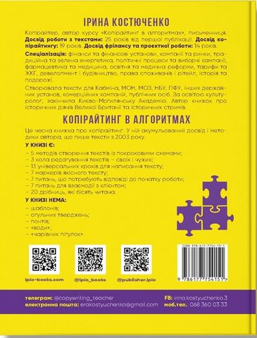 «Копірайтинг в алгоритмах» — авторське видання, яке відкриває внутрішню кухню ремесла копірайтера. У цій книжці акумульований досвід і методики автора, що пише тексти впродовж двадцяти років. Навіть найдосвідченіший експерт почерпне у цій книжці щось нове, або ж знайде предмет для дискусії з іншими експертами.