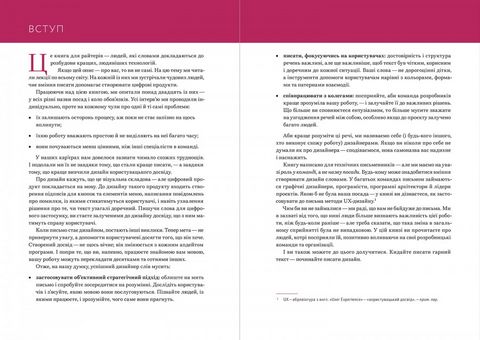 «Письмо — це дизайн» — потужне твердження, яким Майкл Меттс і Енді Велфл визначають роль, що її мають посідати райтери, або (технічні) письменники, у своїх командах і в процесі створення продукту й досвіду користування. Слова не менш важливі, аніж візуальні образи, структура чи технічна досконалість, — бо від них залежить сприйняття, розуміння, настрій користувача. Тож аби кінцевий продукт вийшов цілісним і гармонійним, письменники мають включатися в розробку на найраніших етапах і постійно обмінюватися своїми знахідками й напрацюваннями з рештою членів команди. Ясність та інклюзивність текстів, дотримання голосу компанії та продукту, правильний вибір тону — це, безперечно, важливі складові успіху, і в цій книзі їм приділено багато уваги. Але саме ефективна комунікація в команді, що забезпечить порозуміння та усвідомлення спільної мети, — запорука послідовності тексту та найкращого досвіду користування.