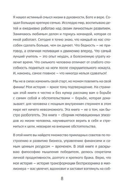 «Путь от беспризорника у миллионеру» – исповедь нашего современника – бывшего бездомного, а ныне успешного предпринимателя. Книга владельца торговой марки Enjoy The Wood Игоря Фостенко будет особенно полезна людям, которые потеряли жизненный ориентир или находятся на распутье. Эта книга о Боге, семье, любви, взаимоотношениях, бизнесе, деньгах, взлетах и падениях, уроках и ошибках — обо всем, без чего невозможна наша жизнь.