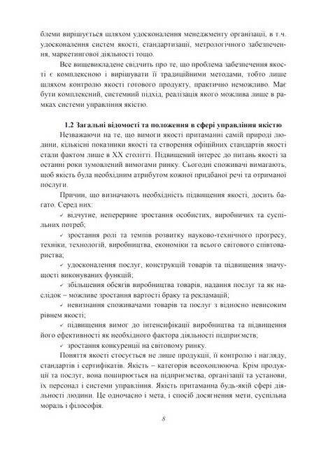 У навчальному посібнику розглянуто сучасні підходи до управління якістю в контексті забезпечення конкурентоспроможності продукції та послуг підприємств готельно-ресторанного бізнесу. Наведено відомості щодо найважливіших етапів розвитку, сучасного стану теорії та практики управління якістю, державної політики у сфері управління якістю. Досліджуються економічні поняття якості, методи аналізу витрат на якість, теоретичні та практичні принципи формування, забезпечення й управління якістю продукції та послуг підприємств сфери гостинності. Наведено вимоги нормативної документації до показників якості в готельно-ресторанному господарстві, характеристику та особливості системи управління якістю для готельних підприємств на основі стандартів ISO 9000. Особлива увага приділяється питанню забезпечення якості та безпечності кулінарної продукції, основним принципам, особливостям розробки та впровадженню програм-передумов системи НАССР у закладах ресторанного господарства готельних