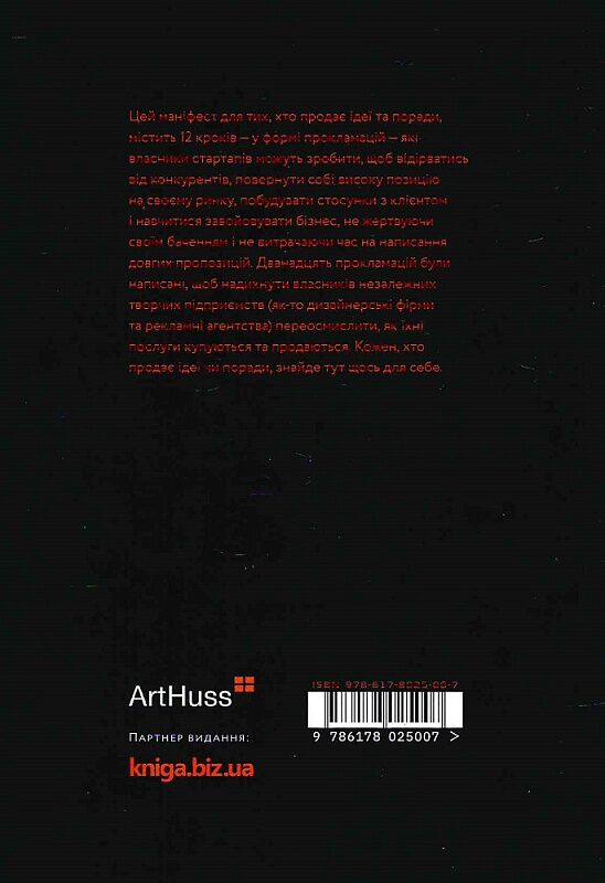 Цей маніфест для тих, хто продає ідеї та поради, містить 12 кроків — у формі прокламацій, — які власники стартапів можуть зробити, щоб відірватись від конкурентів, повернути собі високу позицію на своєму ринку, побудувати стосунки з клієнтом і навчитися завойовувати бізнес, не жертвуючи своїм баченням чи витрачаючи час на написанням довгих пропозицій.