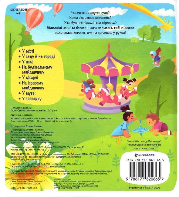 У вас допитливий малюк, у якого сотні запитань, коли ви виходите на прогулянку, чи коли в музеї, зоопарку, на дитячому майданчику чи біля будівництва? Інтерактивна книжка «Світ навколо мене» допоможе зробити ваше спілкування приємних і цікавішим, бо містить багато фактів та відповідей про все, що потрапляє в око малюку. Чому їде авто? Звідки у наших будинках електрична енергія? Зі скількох сніжинок складається сніжка? Як зацвітають рослини? Як утворюється веселка? Де живуть бобри? Як зводять будинки? Що таке веснянки? А що всередині футбольних м’ячів? Чому тигри смугасті? Де сплять кажани? У цій яскравій книжці, з ілюстраціями та елементами-віконечками пошуки відповідей на ці та інші запитання перетворяться на захоплюючу гру. «Світ навколо мене» — це дванадцята книжка з улюбленої серії «Маленькі дослідники» у видавництві #книголав.
