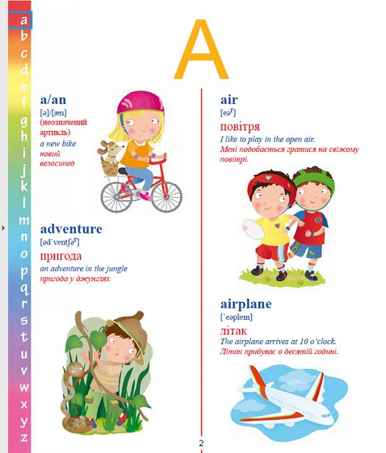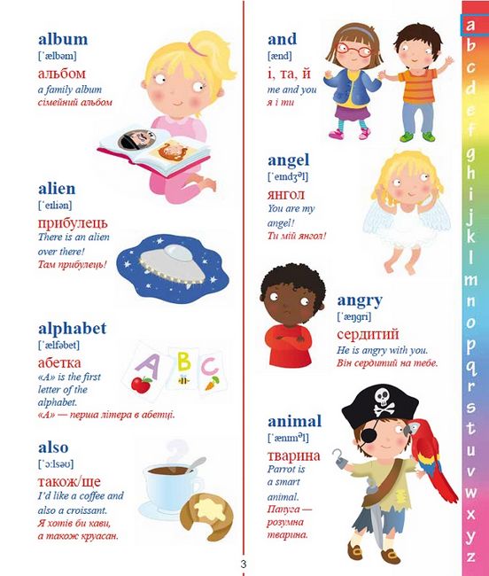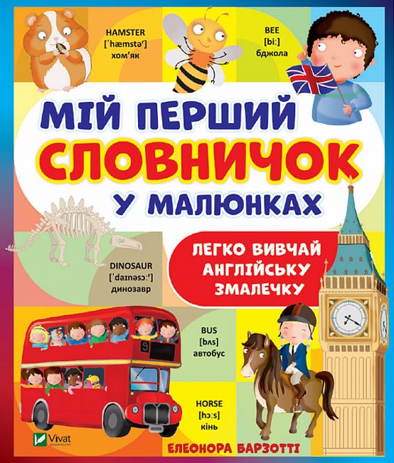 З цим яскравим словничком найменшенькі зможуть розповісти про все, що їх оточує, не лише українською, а й англійською. Під кожним словом подано транскрипцію для правильної вимови, а наведена лексика охоплює найрізноманітніші теми: люди і тварини, їжа і довкілля, дружба і поведінка. Завдяки книжечці малі вундеркінди зможуть вдало підготуватися до занять з іноземної мови в дитсадку чи початковій школі та вразити всіх базовими знаннями вже з першого уроку.