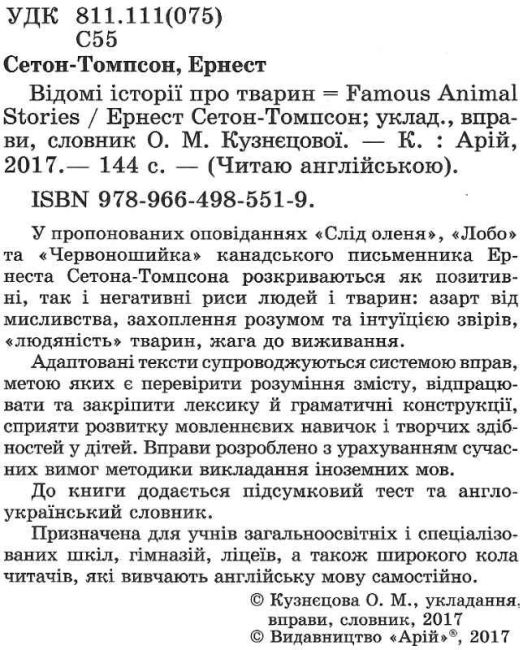 Читаю англійською Відомі історії про тварин / Famous Animal Stories Ернест Сетон-Томпсон (Pre Intermediate А2) Вид-во: Арій 18392