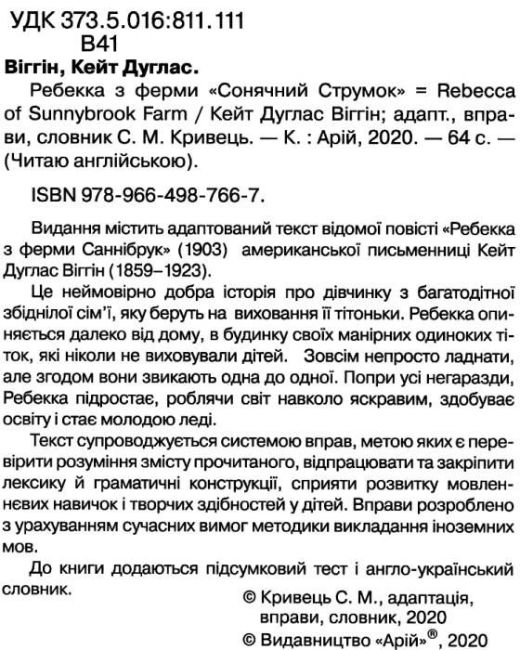 "ЧИТАЮ АНГЛІЙСЬКОЮ РЕБЕККА З ФЕРМИ «СОНЯЧНИЙ СТРУМОК» / REBECCA OF SUNNYBROOK FARM" - це захоплююча книга для читання англійською мовою, призначена для учнів рівня Elementary (A1/A2). Автором цієї книги є Кейт Дуглас Віттін, відомий письменник, який здатен зацікавити читачів різного віку та рівня знань англійської мови. Книга розповідає історію Ребекки, юної героїні, яка виросла на фермі «Сонячний струмок» і мріє про велике майбутнє. Читаючи цю книгу, учні отримують можливість розширити свій словниковий запас, розвинути навички читання та розуміння англійської мови, а також поринути у захопливий світ пригод та відкриттів. Видавництво АРІЙ гарантує якість та доступність цього видання для широкого кола читачів.