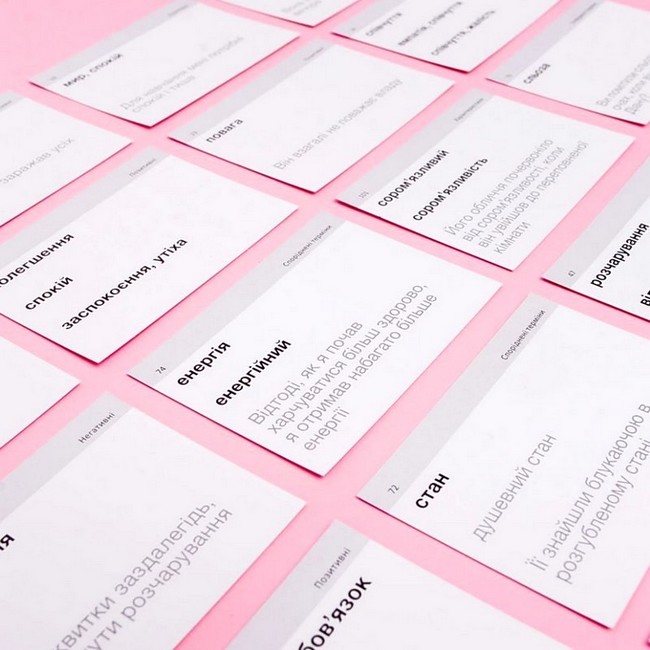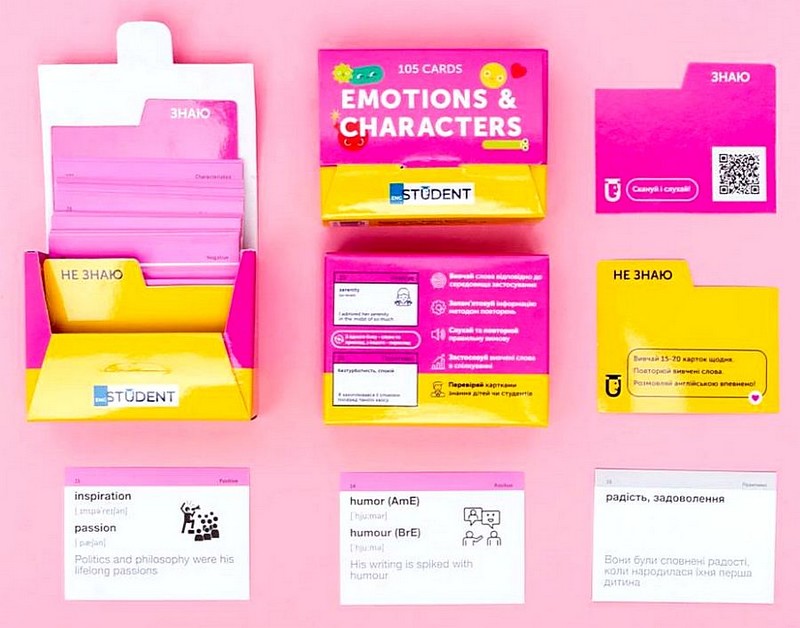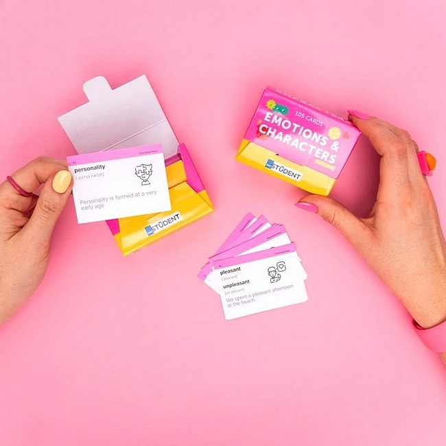 Набір «Emotions & Characters» (рівень А1-А2) — набір з дууууже емоційною лексикою. На картках ми зібрали слова, що описують емоції, стани та характеристики. Ідеально підійде психологам та людям, які цікавлячться ментальним здоров'ям.