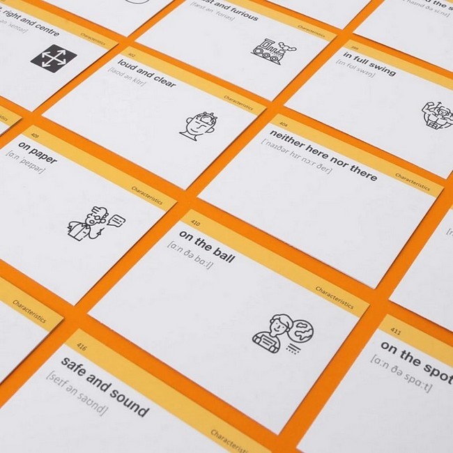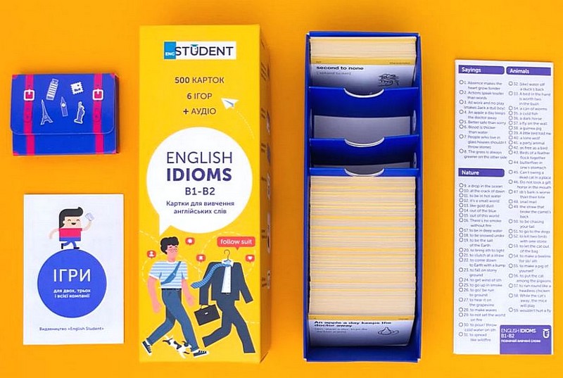 «English Idioms B1-B2» — набір карток для вивчення англійських ідіом середнього рівня складності. Тут зібрані найбільш вживані ідіоми, приказки, прислів'я й сталі вирази англійською та їхні відповідники українською. Обирають ті, хто хоче детальніше ознайомитися з темою ідіом.