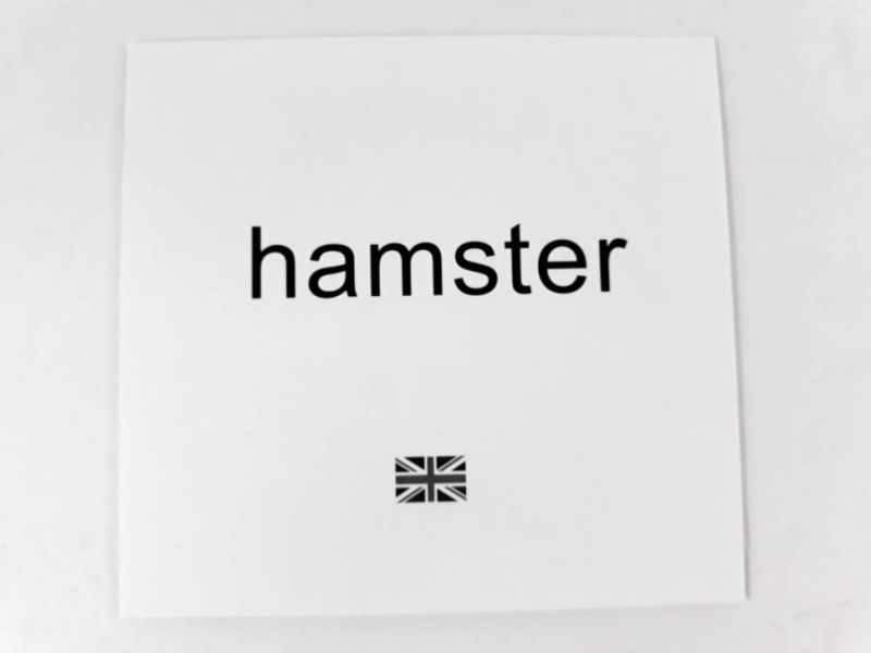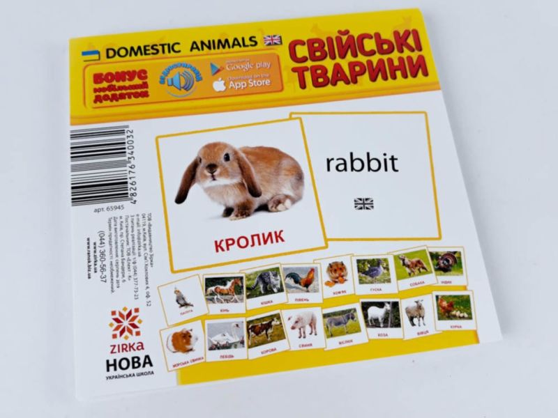 Кожна картка має розмір 110х110 мм і містить зображення різних домашніх тварин, таких як кіт, собака, курка, корова, кролик та інші. Кожне зображення супроводжується назвою тварини як українською, так і англійською мовами.