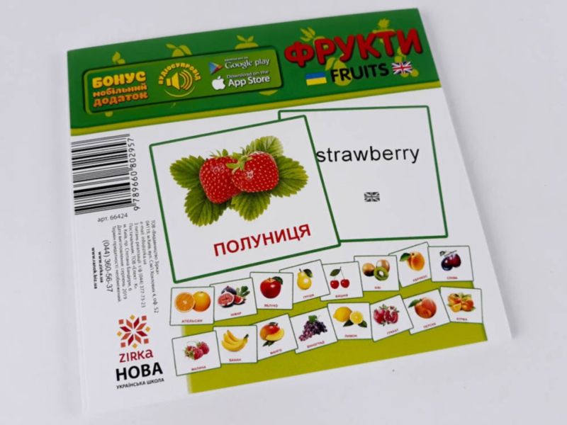 Кожна картка має розмір 110х110 мм і містить зображення різних фруктів, таких як яблуко, банан, апельсин, виноград, кавун та інші. Кожне зображення супроводжується назвою фрукту як українською, так і англійською мовами.