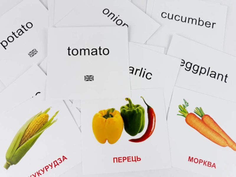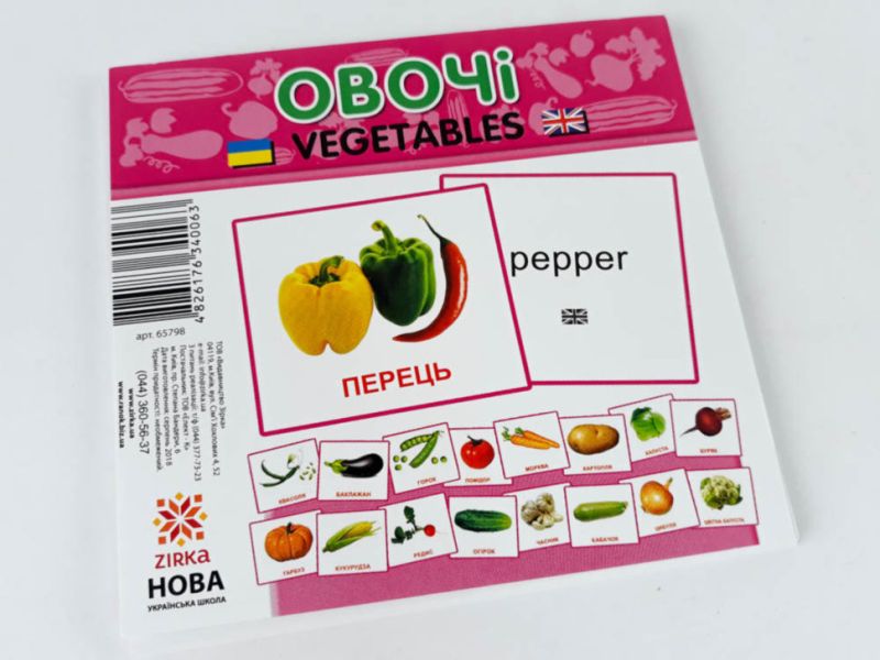 Кожна картка має розмір 110х110 мм і містить зображення різних овочів, таких як морква, помідор, огірок, капуста, буряк та інші. Кожне зображення супроводжується назвою овоча як українською, так і англійською мовами.