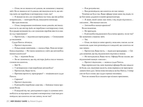 Кіра Дуґґан встигла чудово показати себе на службі в прокуратурі. Однак крах в особистих стосунках зі старшим колегою змусив її шукати нової роботи в адвокатській конторі свого батька. На жаль, становище фірми останнім часом похитнулося через алкоголізм її засновника. Проте амбітна дівчина сподівається відновити репутацію контори й чекає на гучну справу. Їй випадає такий шанс: загадкова смерть дружини одного з найбагатших людей Сієтла сколихнула місто. І ось Кіра Дуґґан, талановита гросмейстерка, вступає у складну гру, де на кону добре ім’я та воля підозрюваного, доля сімейної юридичної фірми та кар’єра самої Кіри. Адвокатка вважає, що найгірше — грати проти прокурора Міллера Амброуза, її колишнього коханця, який палає бажанням помсти. Проте за лаштунками цієї справи стоїть інший, набагато страшніший і вміліший гравець…