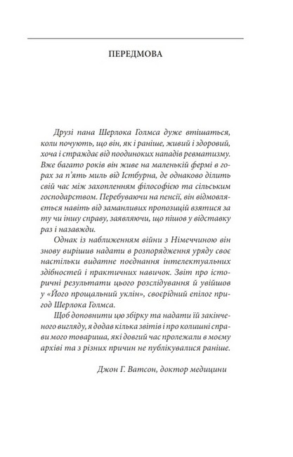 До цієї збірки, виданої в розпал Першої світової війни, 1917 року, ввійшли вісім оповідань, написаних переважно в 1910-ті роки. Автор розповідає про кращого німецького шпигуна в Англії, фон Борка, який готується до від'їзду на батьківщину із секретними документами і якому невтямки, що Шерлок Голмс уже вийшов на його слід («Його прощальний уклін»). «Пригода з картонним пуделком», «Випадок із багряним колом», «Зникнення леді Френсіс Карфекс» — в усіх цих справах, за словами того ж таки доктора Ватсона, славетний сищик справді «перевершує самого себе».
