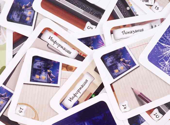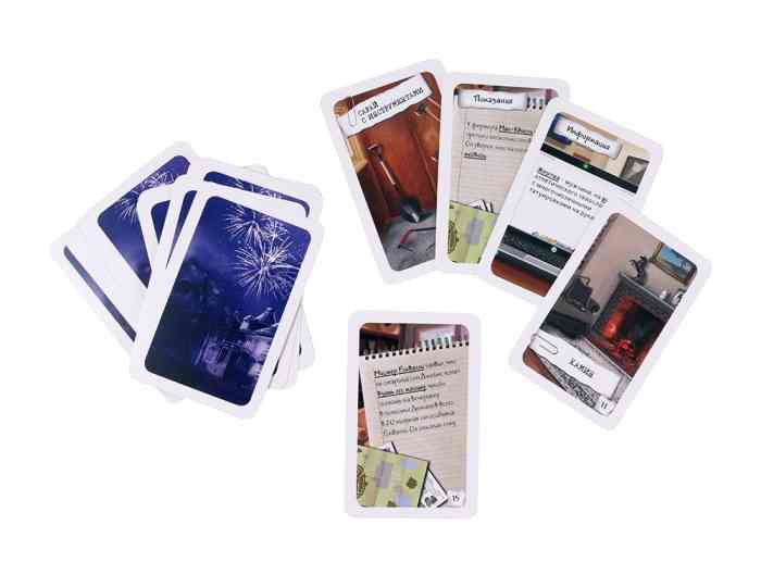 В состав игры входит 37 карт, которые хранят в себе информацию в виде фактов, улик и подсказок.