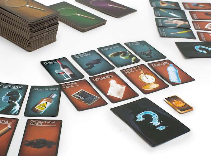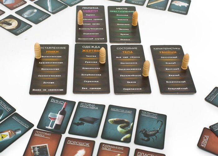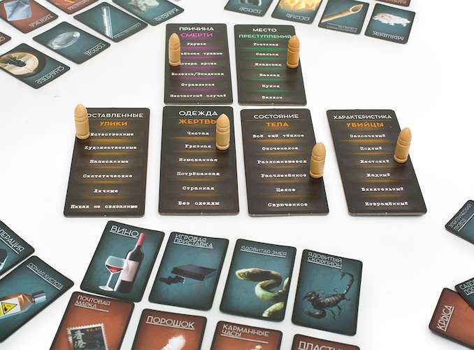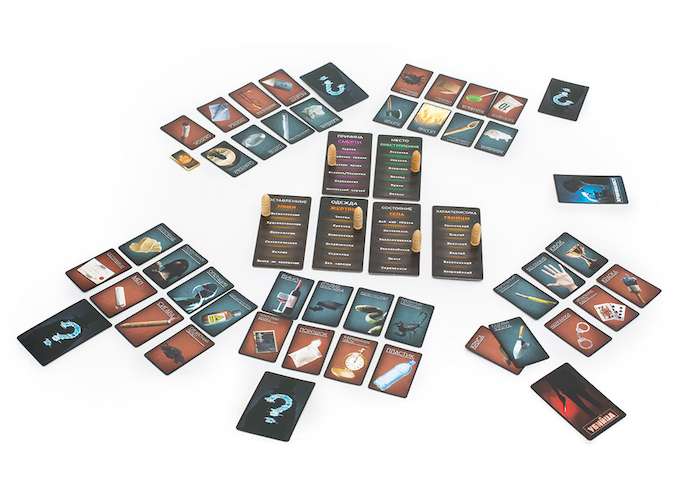 Распределив втемную карты ролей между игроками, все участники, кроме криминалиста, берут по четыре карты улик и по четыре карты орудий преступления. Вы можете удивиться, натыкаясь на оставленные улики! Здесь и череп, и игрушки, журнал и косметическая маска, дверная ручка, чулки, и даже остатки еды. Орудия преступления тоже смогут поразить своим разнообразием: кроме скучных молотка, топора, яда и взрывчатки, встречаются оригинальные ртуть, отравленные иглы и канделябр.