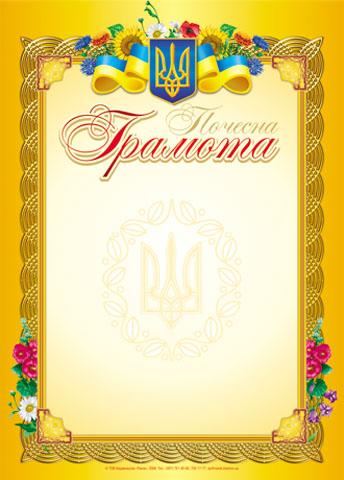 Грамота почесна жовта з ромашками Ранок. Пропонуємо купити почесну грамоту в яскравому жовтому кольорі, із зображенням символіки України і місцем для напису.
