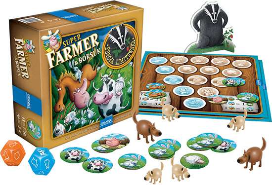 Настольная игра Суперфермер & Барсук полностью повторяет комплектацию базового выпуска плюс включает в себя фигурку нового персонажа – барсука. Как и раньше, основная задача участников – собрать на своей ферме как минимум по одного представителя каждого вида животных: корову, лошадь, овцу, свинью и кролика в то время как хитрые лиса и волк будут пытаться кого-нибудь у вас стащить.