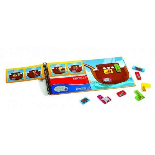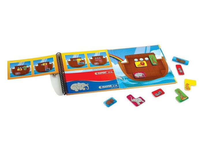 Участникам дорожной магнитной игры Ноев ковчег будет предложено сорок восемь заданий – головоломок разных уровней сложности. Каждая головоломка начинается с расстановки некоторых животных, вашей задачей будет втиснуть на судно тех, кто остался за бортом. Помните, что все животные должны быть размещены рядом со своей парой. К тому же, за границы поля, то есть корабля, выходить нельзя, сами понимаете. После указанных заданий вы обнаружите подсказки, они помогут вам понять, по какому принципу расположены животные, и что от вас требуется или же с ними можно сверить, правильно ли вы выполнили задачу.