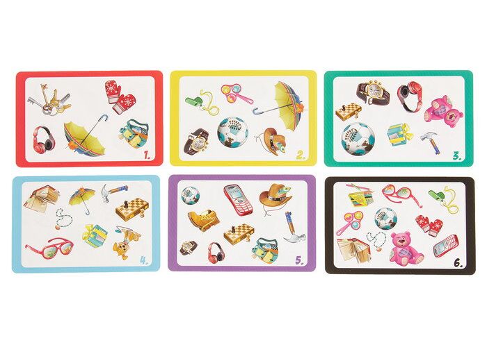 В Бюро находок попала и стопка крупных карт с изображениями разных вещей, именно с ними вам и выпадет играть. Карты поделены на уровни сложности и отличаются цветом рамки и цифрой в нижнем левом углу. Так вы сможете выбирать простые уровни и с легкостью их проходить, или делать микс из карт, соединив всё подряд: и очень простые, и очень сложные задания.