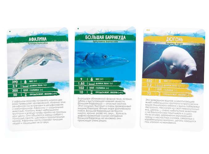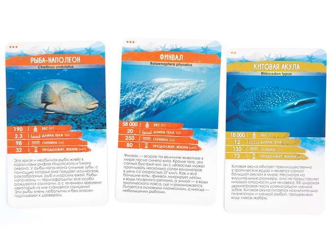 В начале партии следует перетасовать колоду и раздать игрокам по четыре карты, остальную колоду оставьте в центре стола. Участники держат свой набор карт на руках, не показывая другим игрокам. Карточки – это своеобразное досье на морских обитателей. Здесь указана краткая информация о существе, присутствует иллюстрация, а также четыре параметра для сравнения: вес, длина тела, глубина обитания и продолжительность жизни. Также в верхнем левом углу отмечена редкость данного вида: чем больше точек – тем более редкое животное вам попалось.