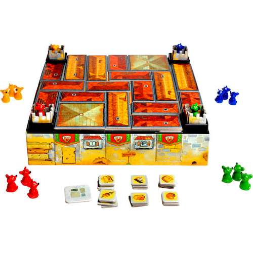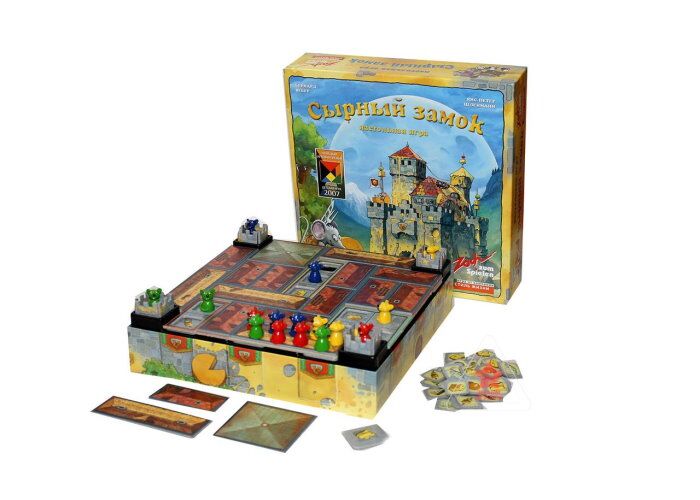 Экскурсия по замку начнется уже с того момента, как вы возьмете в руки коробку и откроете. Ведь она является одновременно и игровым полем, и органайзером для хранения компонентов настольной игры Сырный замок. Перед началом партии действительно необходимо возвести замок. Основой послужит нижняя часть коробки. По углам нужно поставить четыре сторожевые башни. Карточки - тайлы следует расставить случайным образом поверх подземелий (сверху каждой круглой ячейки), а одну оставшуюся просто разместить возле поля. Вторым этажом накладывается сетчатое поле, а уже за ним – размещаются крыши в соответствии к секторам. В игре участвуют по четыре голодные мышки желтого, зеленого, синего и красного цветов. По одной из них ставится на угловую сторожевую башню.