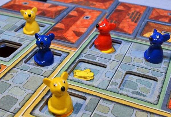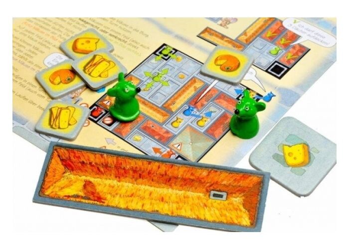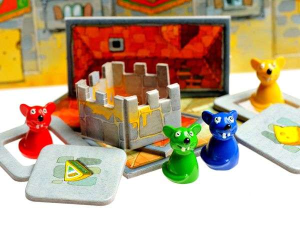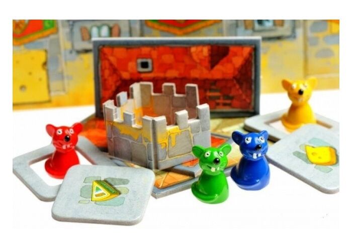 Перед ходом у каждого участника есть по четыре очка, которые можно потратить на ряд действий. Первое – снять крышу замку, граничащую с башней игрока. Делать это необходимо в любом случае, так как мышки не умеют передвигаться по крышам. Второе действие – передвинуть мышонка вправо или влево на одну комнату, не закрытую крышей. Третье – поместить одного незадействованного мышонка на любую свободную башню. И, наконец, четвертое действие – передвинуть комнаты замка. Это можно выполнить с помощью одного свободного тайла, который остался лежать рядом с игровым полем. Стоит просто вставить карточку – тайл в одно из трёх отверстий на стене замка, обозначенных красным флагом. Выполнив это действие, все комнаты одной линии подвигаются в сторону на одно деление, а последняя выпадает. Если в результате такого действия под мышкой оказывается пропасть – она падает и навсегда покидает игру. После каждого хода все свободные от мышей комнат обратно накрываются крышами. Победа достается тому, кто соберет четыре разных сырных карточки. Каждую их них можно получить, оказавшись двумя своими мышками в комнатах с одинаковым сортом сыром. А вот если три ваших мыши провалились в ловушку – игра Сырный замок для вас окончена.
