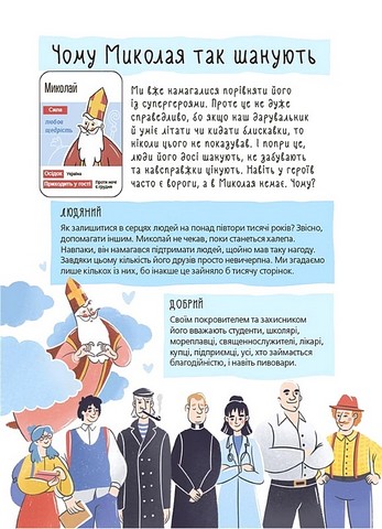 \nМандруючи цікавими історіями, ти зможеш краще познайомитися зі Святим Миколаєм та традиціями України, дізнаєшся раніше невідомі факти про його друзів та родичів з різних куточків планети, яких об’єднує головне — любов до дітей!