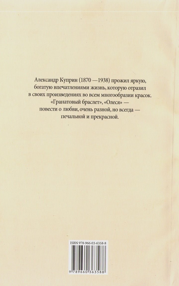 «Гранатовый браслет» и «Олеся» — повести о любви, очень разной, но всегда — печальной и прекрасной. Они полны самых разнообразных событий и чувств.