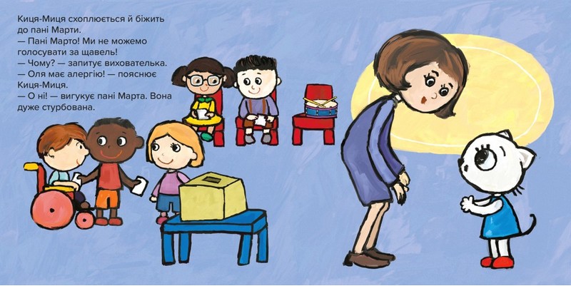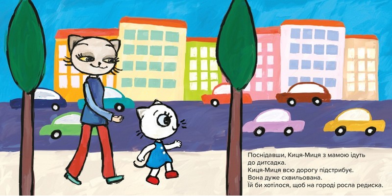 Киця-Миця любить пригоди й нові знайомства! З нею можна вирушити в бібліотеку, у дитячий садочок, у басейн, на ігровий майданчик, на пляж, у мандрівку потягом. Киця-Миця навчить вітатися і чемно відмовляти, чистити зубки, ділитися іграшками й не боятися страховиськ. З нею ніколи не нудно!